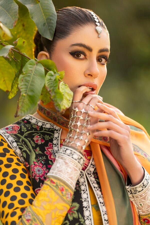 A radiant yellow dress paired with a farshi shalwar and a koti.This season’s trending silhouette is reimagined with vibrant hues and intricate embroidery, making it the perfect statement piece for summer soirées.